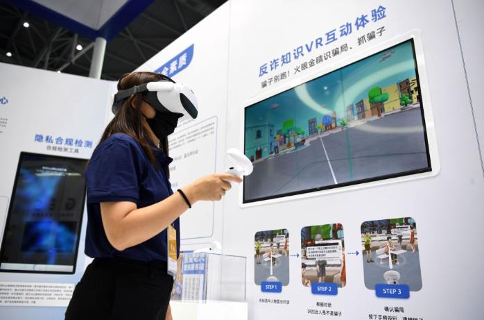 9月4日,一家參展企業代表在2022年國家網絡安全宣傳周網絡安全博覽會上演示反詐知識VR互動體驗項目。新華社記者 劉軍喜 攝