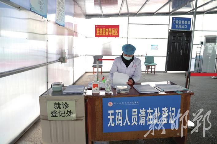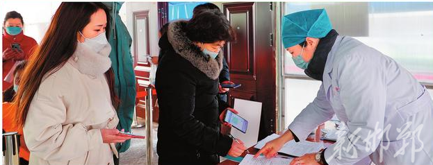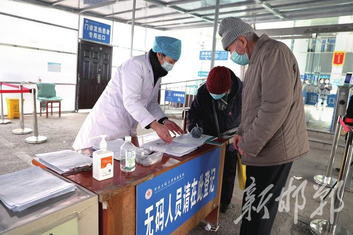 1月14日上午10點(diǎn),陽(yáng)光依舊懶洋洋的,看著明媚,但曬在人身上,絲毫沒有暖意,伴著北風(fēng),依舊只覺得寒氣逼人,記者裹了裹衣服,來(lái)到了河北工程大學(xué)附屬醫(yī)院門診大樓外的預(yù)檢分診處。在這里,前來(lái)就診的患者絡(luò)繹不絕。每位患者進(jìn)入醫(yī)院就診前,都要進(jìn)行掃碼、測(cè)體溫、簽署就診患者及家屬特別疫情告知承諾調(diào)查表。預(yù)檢分診處護(hù)士王麗云,站在寒風(fēng)中堅(jiān)守,一刻不停地忙碌著。