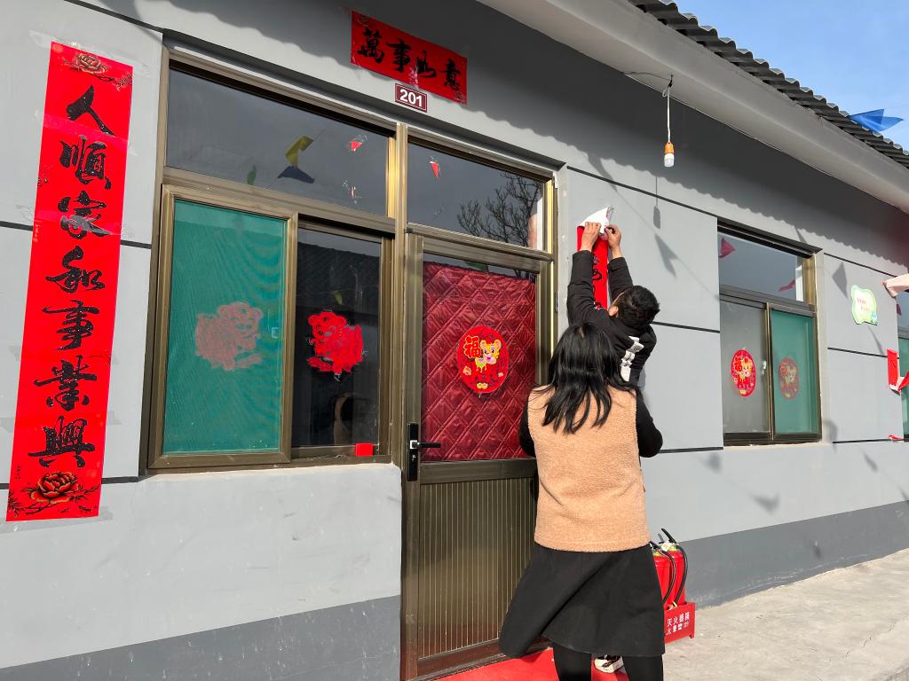張繼鵬和妻子為“新居”貼春聯。(新華社記者張磊攝)