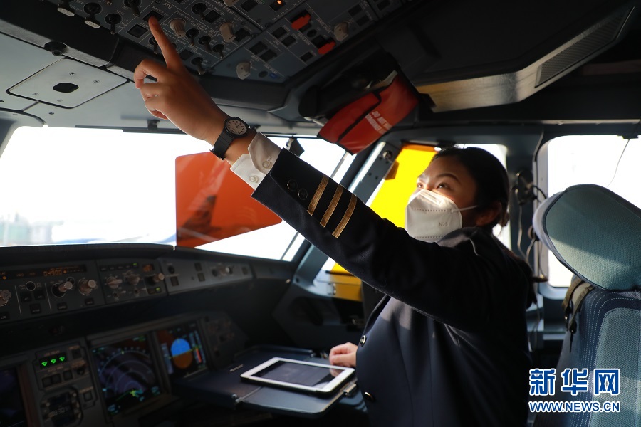 楊靜正在駕駛艙做飛行前的準備。新華網發(黃勇 攝)