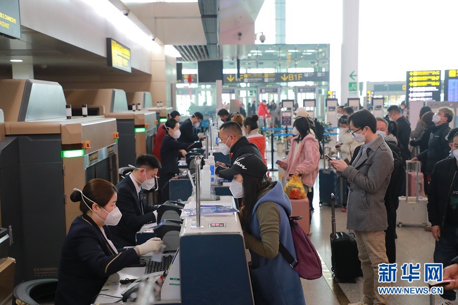 在重慶江北國際機場,旅客們正在排隊進入候機廳。新華網發(黃勇 攝)