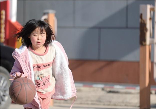 下午氣溫回升,在一個村口的廣場上,孩子們在陽光下嬉鬧玩耍,村民們戴著口罩相互寒暄。