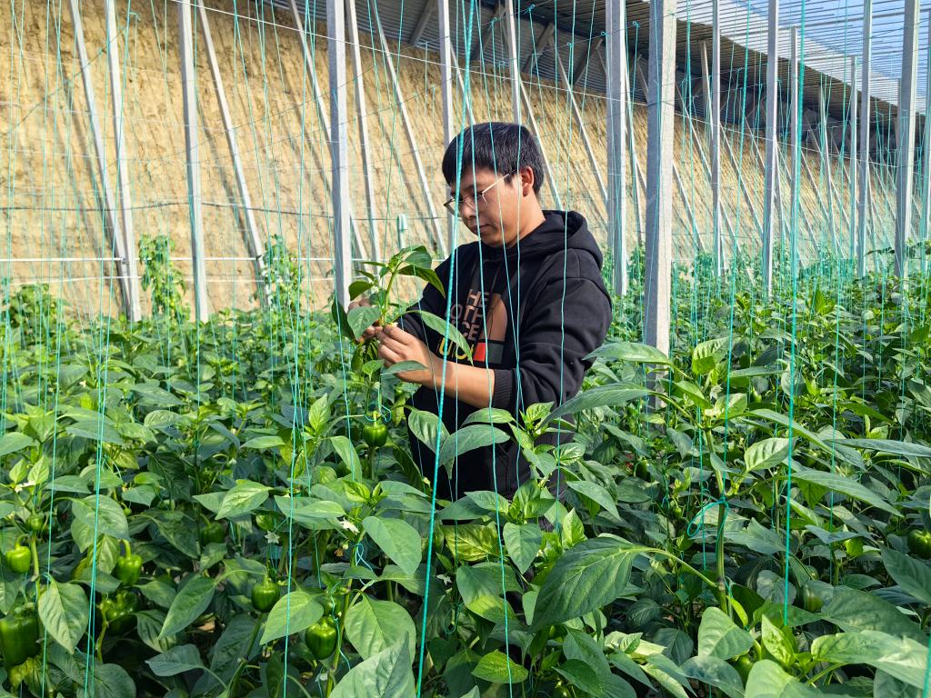 賣彩椒的菜農里,有個羽絨服里套著文化衫的青澀面孔。村黨支部副書記尹成友招呼著記者:“這就是我們回鄉大學生、菜農李庚。”