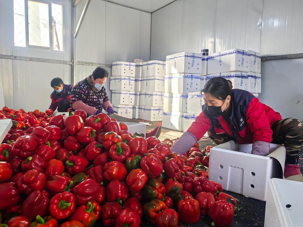臘月二十六,北方小年已過去3天,正是忙年的時候:逛逛集市、備備年貨、走走親戚。但進入東斟灌村,村頭的交易市場、村北的彩椒大棚都還是一片忙碌。老菜農李義海等人騎著電動三輪車拉著整車的彩椒卸到市場的倉庫里。這些彩椒將被集中裝車,發往成都、貴陽等地,部分還出口俄羅斯。