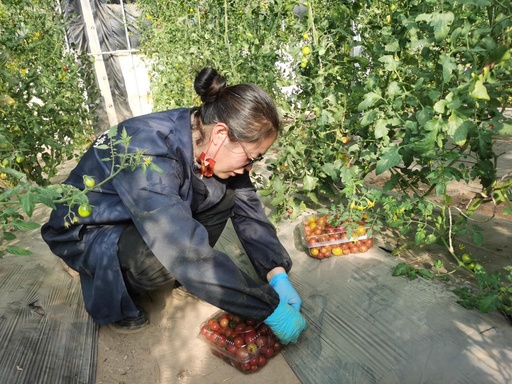 圖為馬雅鈴在大棚里摘小番茄。(受訪者供圖)