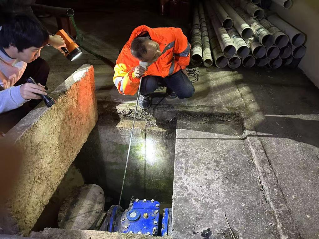1月14日凌晨,護水工出發尋聲。一根聽音桿,一頭覆在耳上,一頭插在泥土里或者貼在水泥地上,草叢、溝坎、井下……每走一兩步就要停下來聽一聽。接近疑似漏水點附近要一邊慢慢走一邊仔細聽,直到確定漏水點,整個過程需要彎腰行走幾公里。