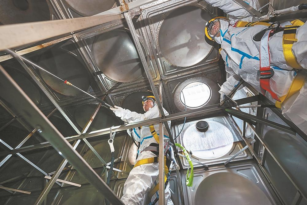 護水工在清洗水箱。新華社發(施辰靜 攝)