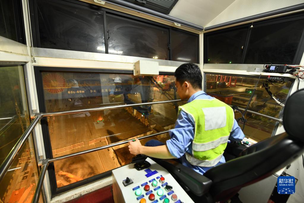 在廣西北海鐵山港,門機司機黃冠在進行夜間作業(9月21日攝)。新華社記者 黃孝邦 攝