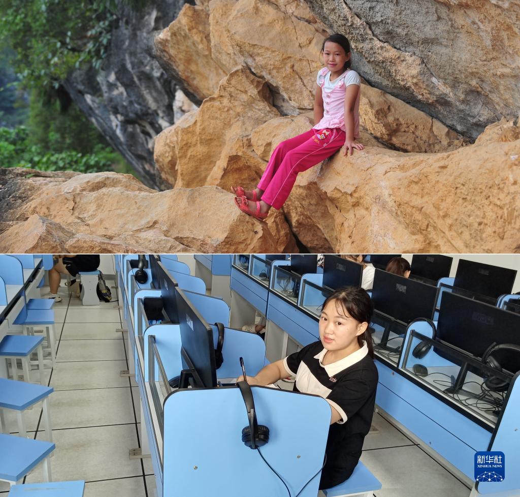 這是一張拼版照片,上圖為:在廣西大化瑤族自治縣板升鄉弄雷村哈保屯,11歲的蒙秋艷在懸崖邊休息,這一處約300米長的半山懸崖,是她讀小學期間每天都要走的路(2012年9月5日新華社記者黃孝邦攝);下圖為:已經實現大學夢想的蒙秋艷,就讀于廣西醫科大學,這是她在學校的語音室學習(新華社發,2022年9月5日韋婷婷攝)。新華社發