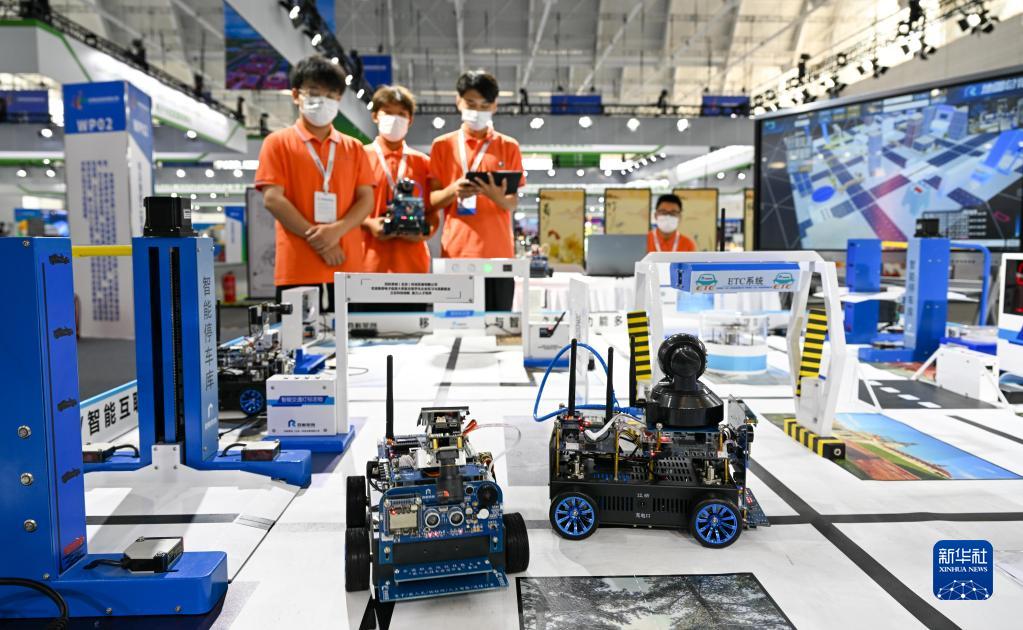 在天津舉行的世界職業技術教育發展大會首屆世界職業院校技能大賽上,參賽選手在實訓沙盤前操作機器人設備(2022年8月20日攝)。新華社記者 孫凡越 攝