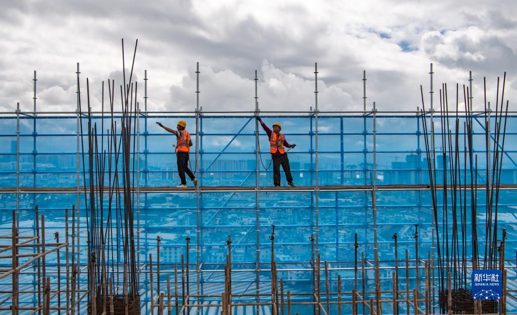 10月2日,中建七局西南公司工人李忠文(右)與王應華在昆明斗南花卉小鎮花卉產業綜合配套服務區項目建設工地施工。新華社記者 江文耀 攝