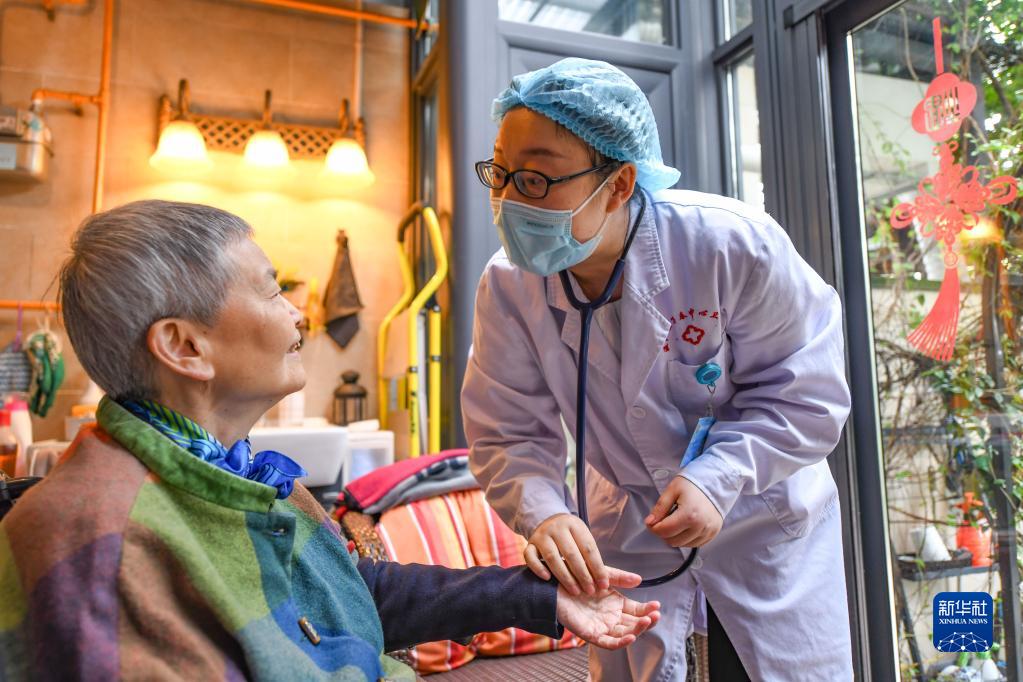 在四川省成都市溫江區萬春鎮天鄉路社區居民家中,家庭醫生楊靜(右)在詢問居民葉茂群近期的身體情況(2022年5月18日攝)。新華社記者 王曦 攝