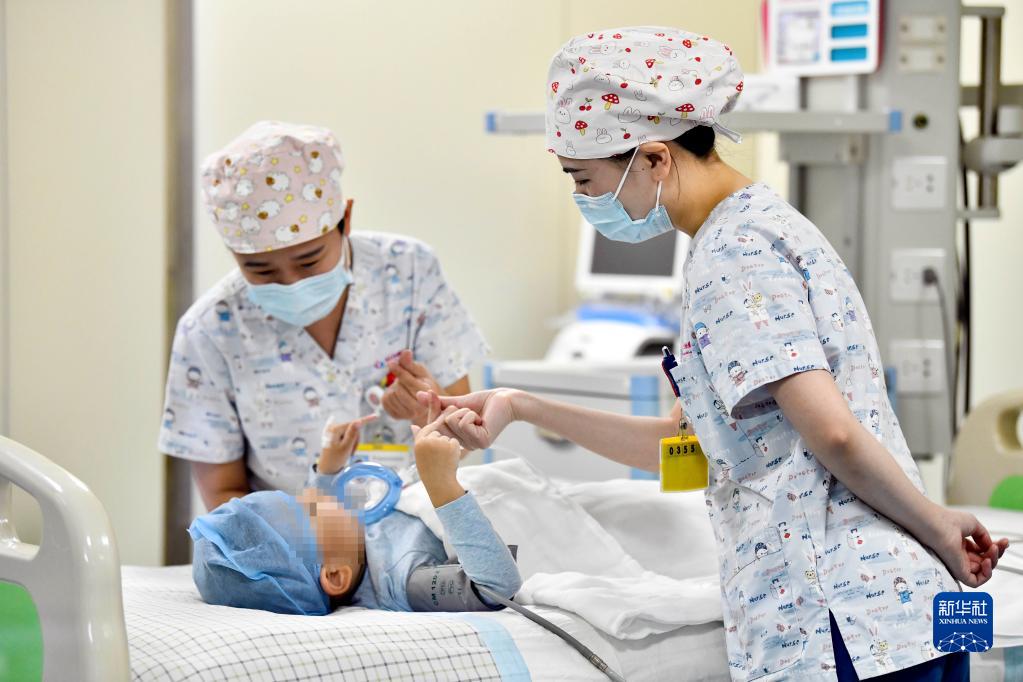 在山東省棗莊市婦幼保健院兒童ICU病房,醫護人員為完成靶向治療藥物諾西那生鈉的4歲脊髓性肌萎縮癥患兒加油鼓勁(2022年1月1日攝)。諾西那生鈉注射液是我國首個獲批治療脊髓性肌萎縮癥的進口藥物,2019年進入中國市場時,每針價格近70萬元。在2021年國家醫保目錄藥品談判中,以3.3萬元每針的價格進入新版醫保藥品目錄。新華社記者 郭緒雷 攝