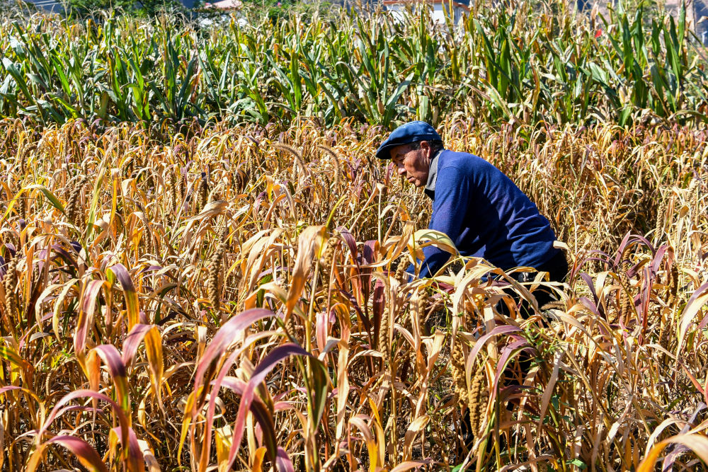 山西省左權縣麻田村的脫貧戶在收割谷子。(新華社記者 曹陽2020年10月16日攝)
