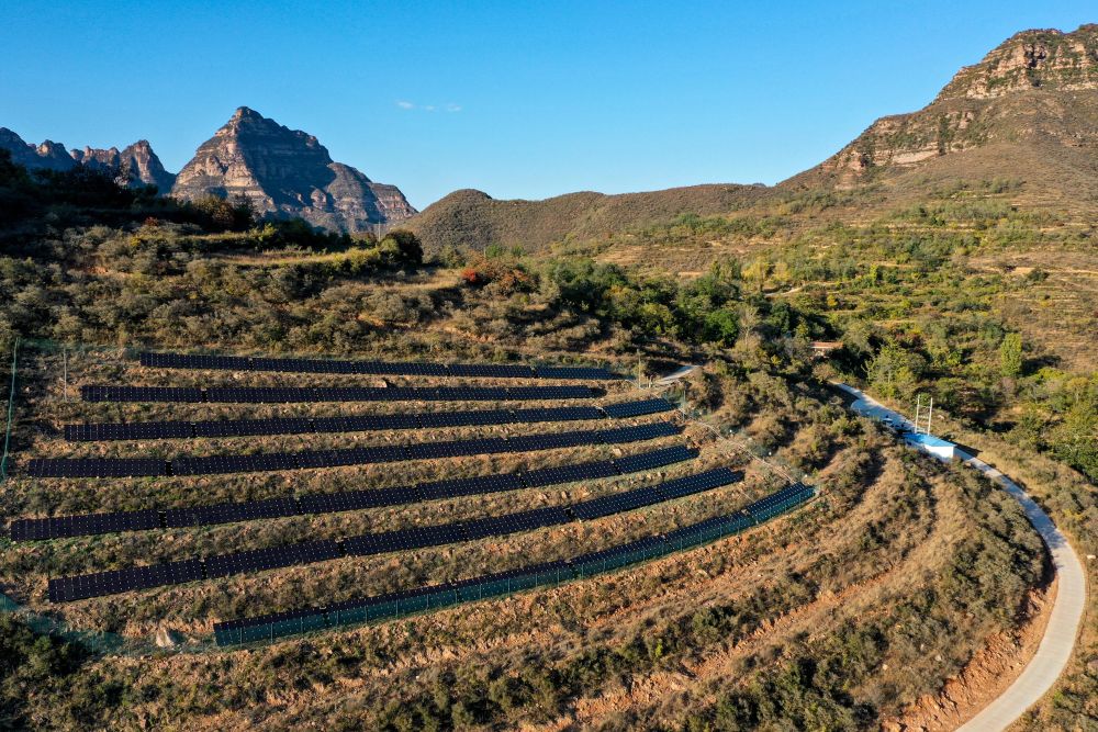 山西省左權縣麻田村的村級光伏電站。(無人機照片,新華社記者 曹陽2020年10月16日攝)