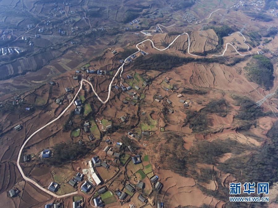 這是四川省涼山彝族自治州美姑縣九口鄉四峨吉村約6公里的道路硬化項目(2017年2月12日攝,無人機照片)。2015年8月,蔣富安由涼山州審計局派到美姑縣九口鄉四峨吉村任駐村第一書記,2016年8月22日因勞累猝死,年僅26歲。新華社記者 劉坤 攝
