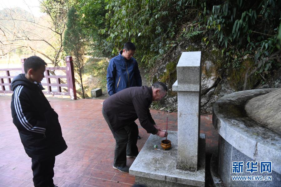 在廣西興安縣華江瑤族鄉水埠村,趙良英的兒子李貴達(中)、孫子李毅和曾孫李銘哲(左)在祭掃紅軍烈士墓(2020年12月30日攝)。新華社記者 陸波岸 攝