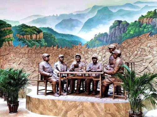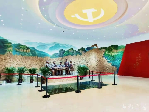 進入展館大門便是序廳,迎面一幅革命潮流洶涌激蕩的大型浮雕映入人們的眼簾。浮雕前面是一組生動的人物雕塑,從左到右依次是滕代遠、徐向前、劉伯承、鄧小平、楊秀峰、薄一波,他們在冶陶這塊紅色的土地上運籌帷幄,決勝千里。