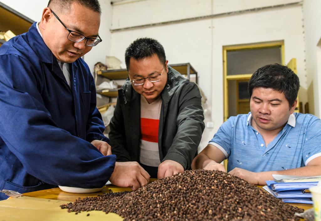 石河子農業科學研究院棉花研究所所長秦江鴻(左)和同事在研究所挑選準備做育種實驗的棉花種子(2019年4月10日攝)。新華社記者 王菲 攝