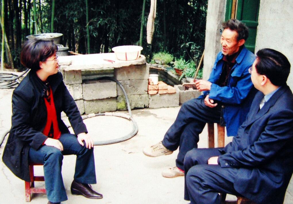 王瑛(左)生前下鄉與群眾交談,共商致富之策。(資料照片)