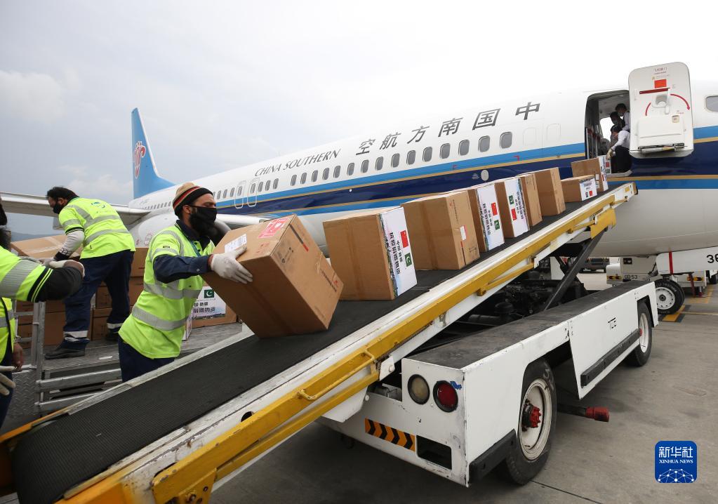 2020年3月28日,在巴基斯坦伊斯蘭堡國(guó)際機(jī)場(chǎng),工作人員卸載中國(guó)捐贈(zèng)的醫(yī)療救治物資。新華社記者 劉天 攝