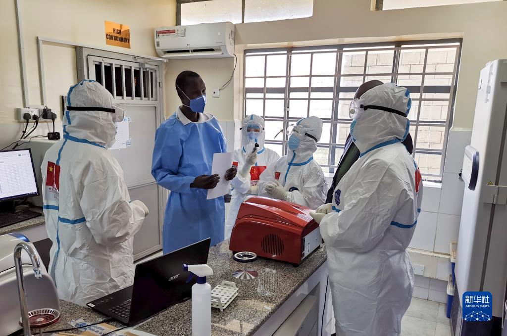 2020年8月21日,在南蘇丹首都朱巴的一處新冠病毒檢測(cè)機(jī)構(gòu),中國(guó)抗疫醫(yī)療專家組成員與當(dāng)?shù)蒯t(yī)護(hù)人員交流。新華社發(fā)(中國(guó)駐南蘇丹大使館供圖)
