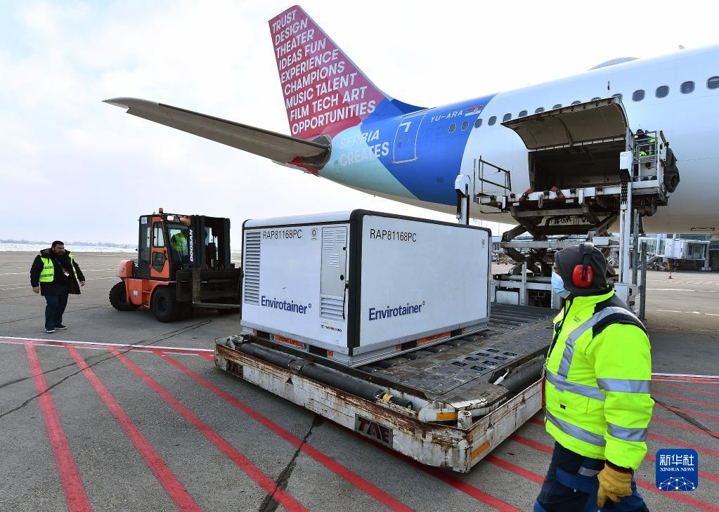 2021年1月16日,在塞爾維亞首都貝爾格萊德,機(jī)場(chǎng)工作人員卸載由中國(guó)國(guó)藥集團(tuán)生產(chǎn)的新冠疫苗。新華社發(fā)(普雷德拉格·米洛薩夫列維奇攝)