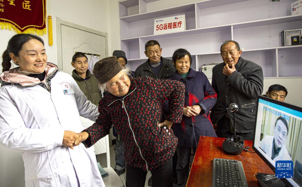 安徽省金寨縣大灣村村民方臨芳(前左二)指著自己身體疼痛的部位,在村醫(yī)袁玲(左一)的幫助下向5G遠(yuǎn)程醫(yī)療會(huì)診的專家講述病情(2020年12月3日攝)。新華社發(fā)(陳力 攝)