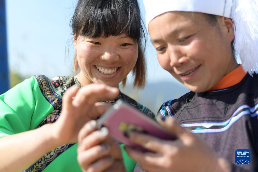 在貴州省黔東南苗族侗族自治州榕江縣水尾水族鄉(xiāng)拉術(shù)村,一位村民(右)在學(xué)習(xí)使用手機(jī)(2020年10月24日攝)。新華社記者 楊楹 攝