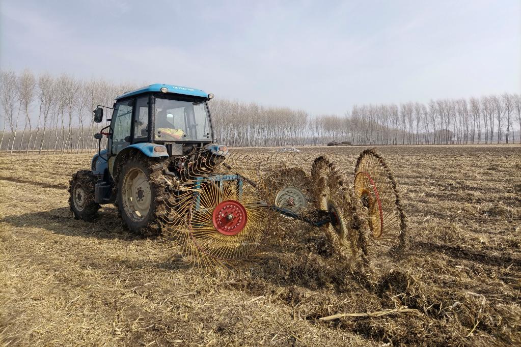 2022年4月4日,吉林德強種植業家庭農場農民在田間進行秸稈歸行作業。新華社發