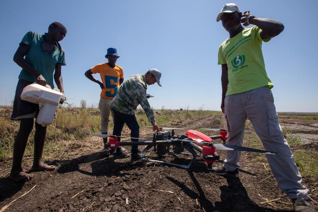 2019年11月28日,在莫桑比克的萬寶莫桑農業園,中國農業專家(右二)指導當地工人使用無人機噴灑除草劑。新華社記者 張宇 攝