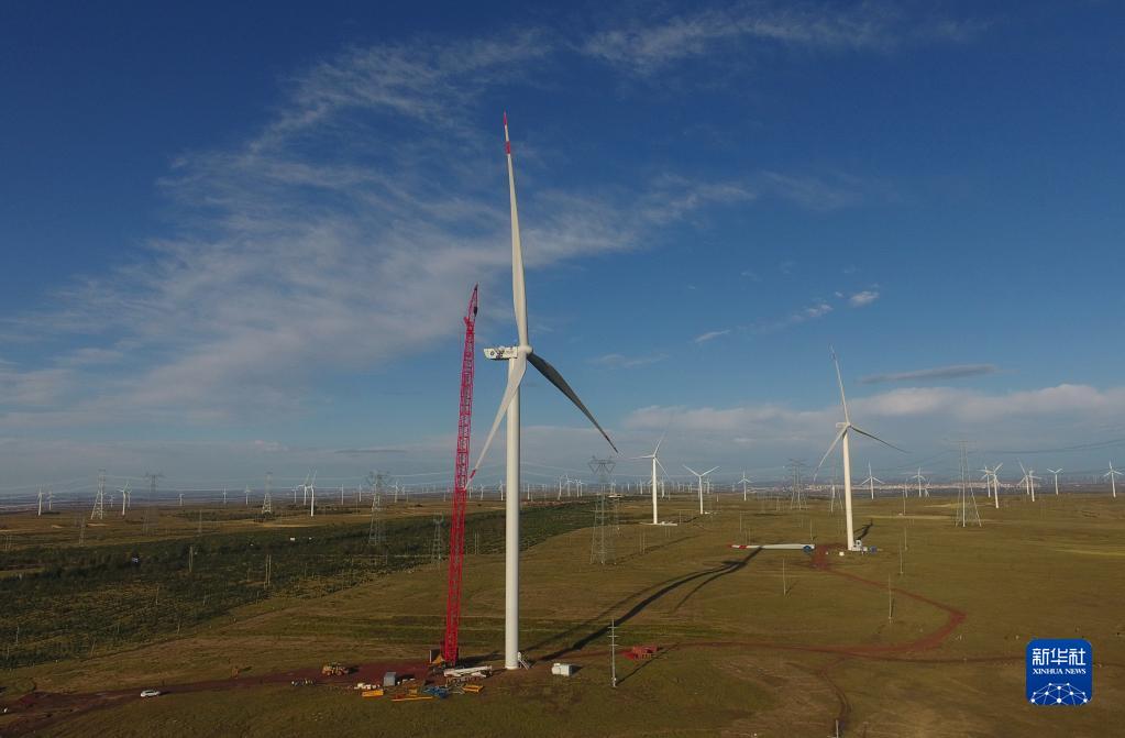 在河北張家口市張北縣大河鄉,工人在一處風電場安裝風力發電機(2020年9月15日攝,無人機照片)。新華社記者 楊世堯 攝
