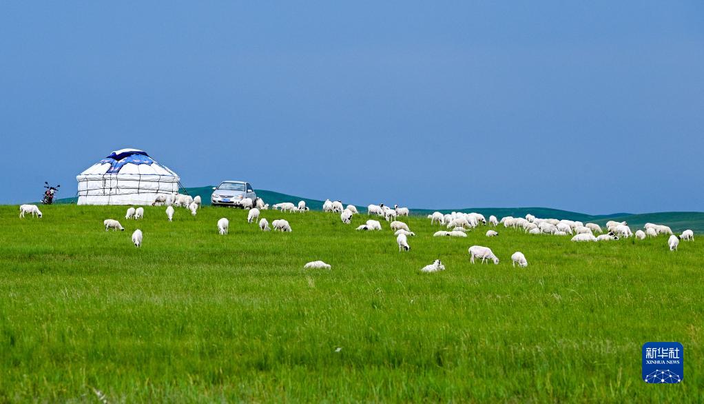 羊群在內蒙古錫林郭勒盟的草原上覓食(2021年7月15日攝)。新華社記者 連振 攝