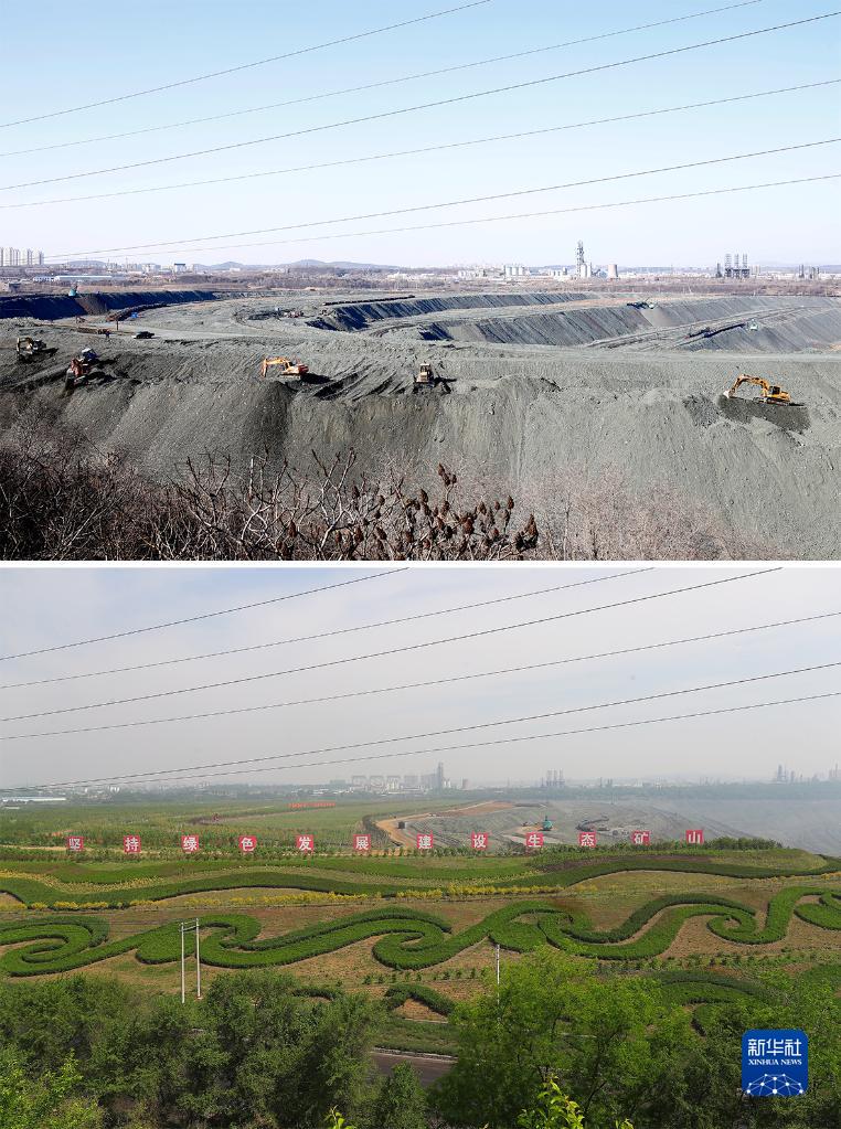 拼版照片:上圖為遼寧省撫順市西露天礦部分區域生態恢復前的場景(2019年3月6日攝,資料照片);下圖為遼寧省撫順市西露天礦部分區域生態恢復后的場景(新華社記者楊青2022年6月2日攝,無人機照片)。新華社發