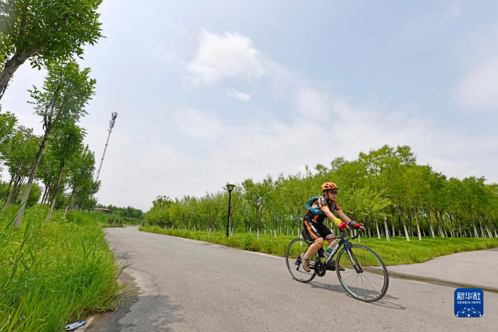 游客在天津市津南區(qū)綠色生態(tài)屏障辛莊灣內(nèi)騎行(7月10日攝)。 新華社記者趙子碩攝