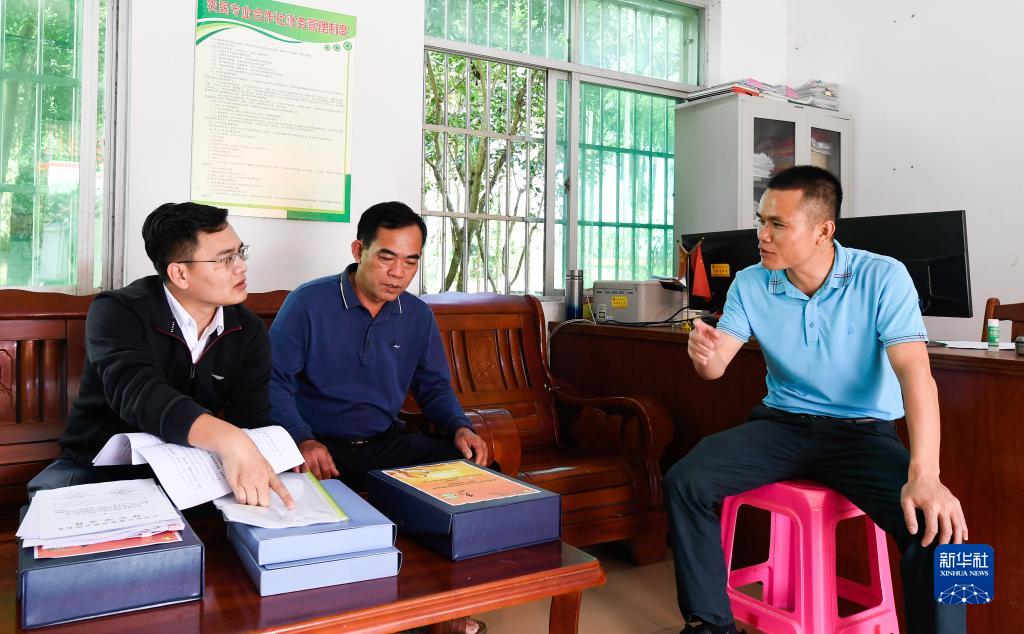 在海南省瓊中黎族苗族自治縣灣嶺鎮(zhèn)加章村委會,紀(jì)檢監(jiān)察干部(左一)在查閱鄉(xiāng)村振興及村級財(cái)務(wù)支出相關(guān)材料(2021年11月13日攝)。新華社記者 楊冠宇 攝
