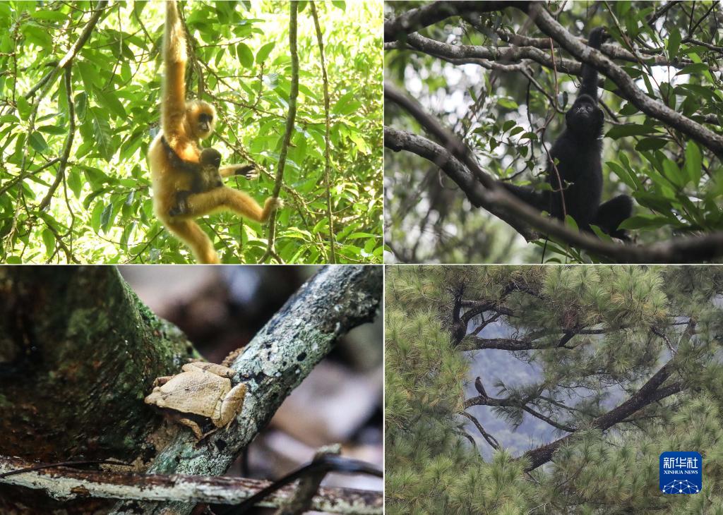 拼版照片:左上圖為2021年5月拍攝的海南長臂猿B群幼猿(海南熱帶雨林國家公園管理局供圖);右上圖為在海南熱帶雨林國家公園體制試點區霸王嶺自然保護區內拍攝的海南長臂猿(2019年10月25日新華社記者蒲曉旭攝);左下圖為在霸王嶺自然保護區內拍攝的姬蛙(2019年10月26日新華社記者蒲曉旭攝);右下圖為在霸王嶺自然保護區內拍攝的蛇雕(2019年10月26日新華社記者蒲曉旭攝)。 新華社發