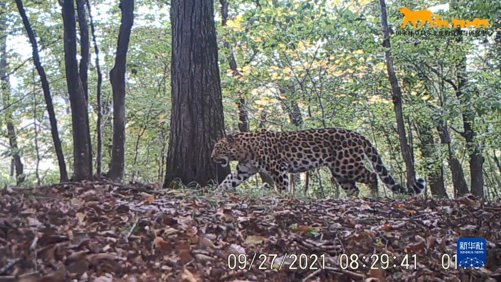 這是2021年9月27日利用“天地空一體化監測系統”在東北虎豹國家公園內監測到的野生東北豹影像(視頻截圖)。 新華社發