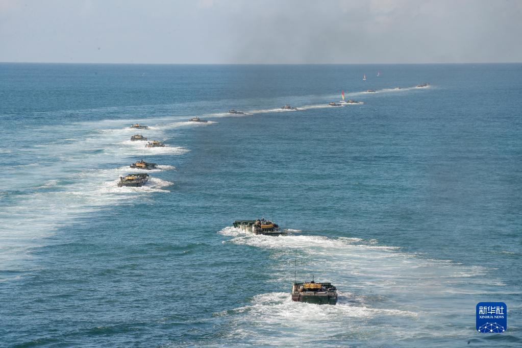 陸軍第74集團軍某合成旅兩棲裝甲車進行海上泛水編波訓練(2020年8月14日攝)。新華社發(李彬 攝)