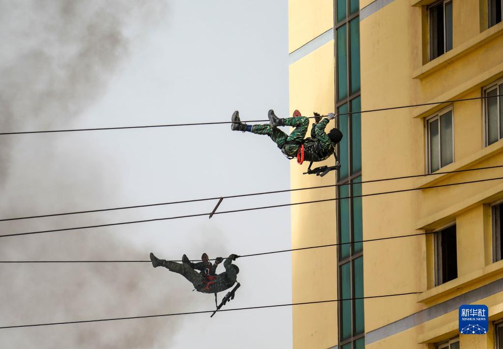 在模擬反恐演練中,武警獵鷹突擊隊特戰隊員利用鐵索接近被“恐怖分子”占據的樓房(2019年4月4日攝)。新華社發(楊志毅 攝)