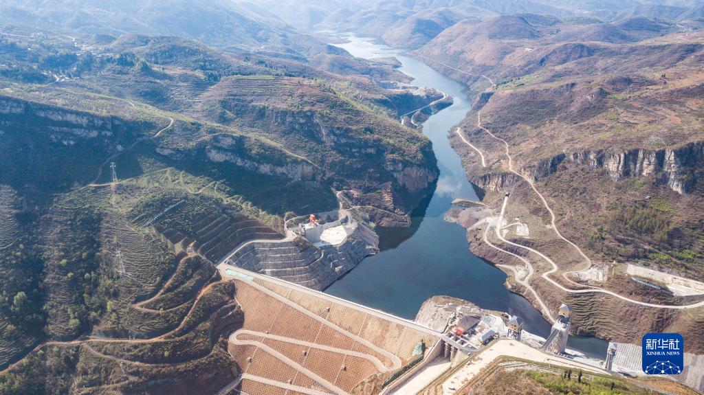 這是在位于烏蒙山區的貴州省納雍縣六沖河畔拍攝的夾巖水利樞紐工程(2022年3月17日攝,無人機照片)。新華社記者 陶亮 攝