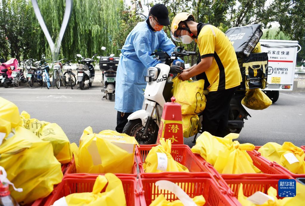 在河北省石家莊市裕華區一家超市保供點,外賣人員在打包,準備為市民送貨(2022年8月30日攝)。新華社記者 楊世堯 攝