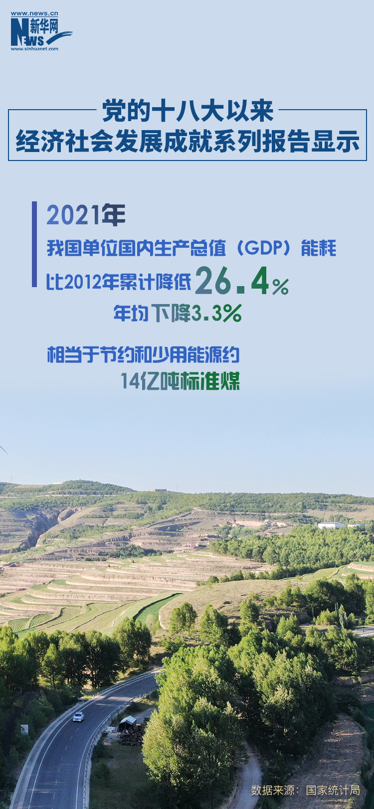 新華社北京10月8日電(記者魏玉坤)國家統計局8日發布的黨的十八大以來經濟社會發展成就系列報告顯示,2021年,我國單位國內生產總值(GDP)能耗比2012年累計降低26.4%,年均下降3.3%,相當于節約和少用能源約14億噸標準煤。