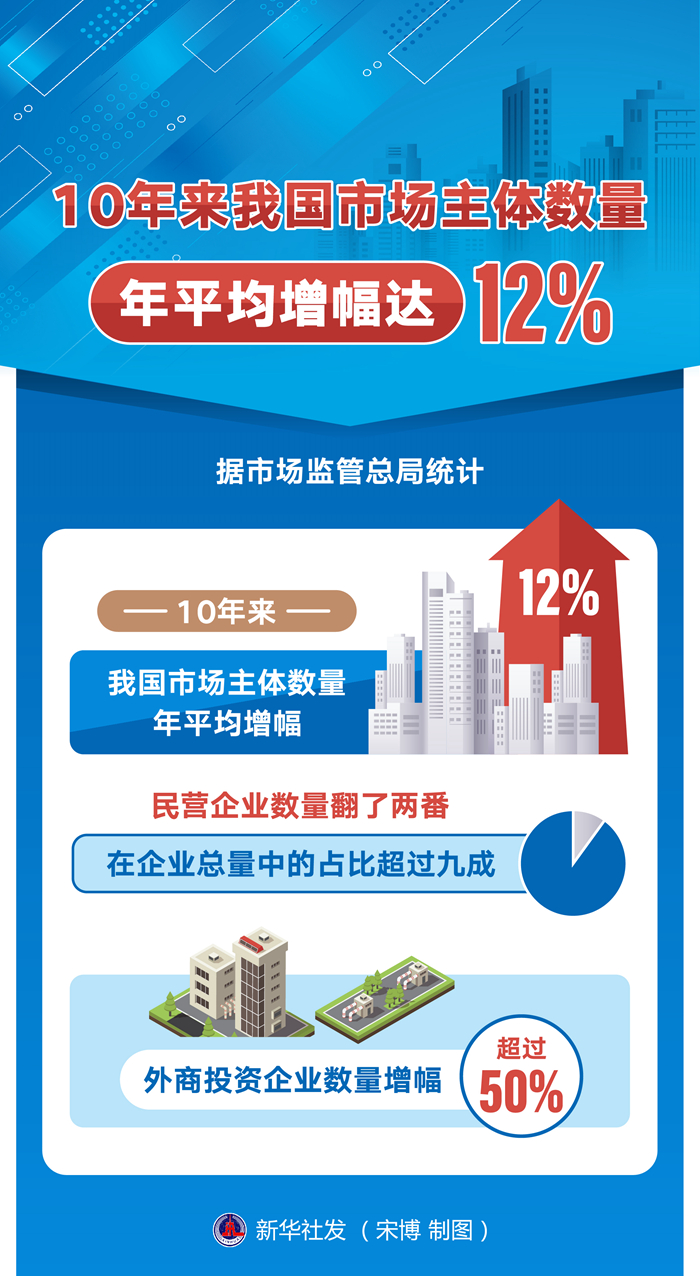 新華社北京10月13日電(記者趙文君)據市場監管總局統計,10年來,我國市場主體數量年平均增幅達12%;民營企業數量翻了兩番,在企業總量中的占比超過九成;外商投資企業數量增幅超過50%。