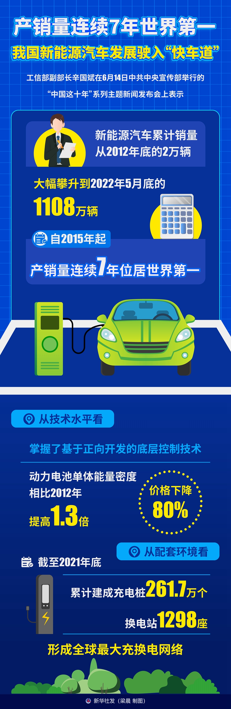 新華社北京6月14日電(記者張辛欣)新能源汽車累計銷量從2012年底的2萬輛,大幅攀升到今年5月底的1108萬輛,自2015年起,產銷量連續7年