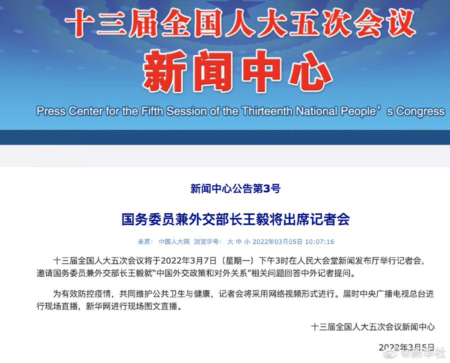 十三屆全國人大五次會議將于3月7日(星期一)下午3時在人民大會堂新聞發布廳舉行記者會,邀請國務委員兼外交部長王毅就中國外交政策和