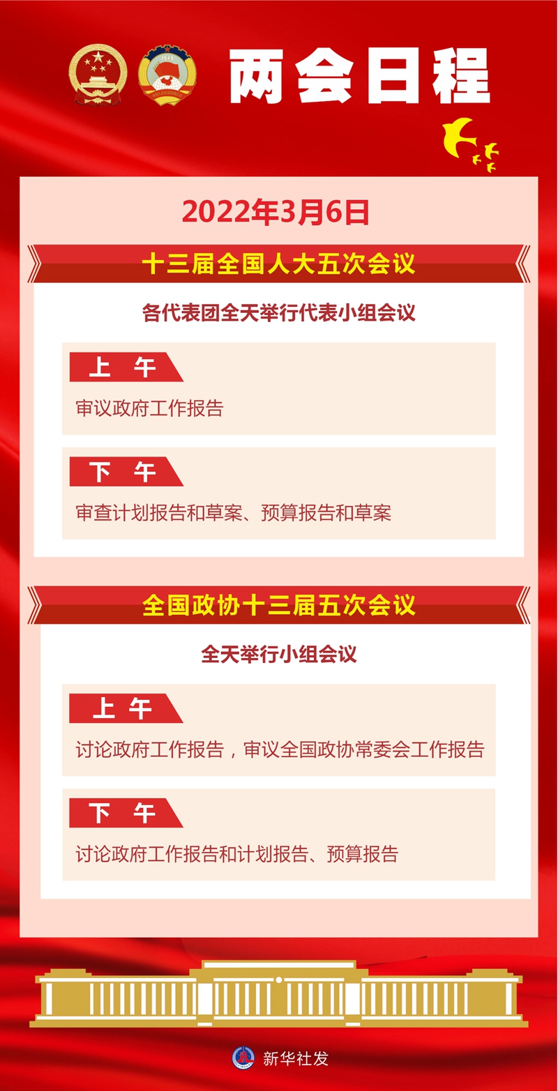 新華社北京3月5日電 十三屆全國人大五次會議各代表團6日全天舉行代表小組會議。上午審議政府工作報告,下午審查計劃報告和草案、預算