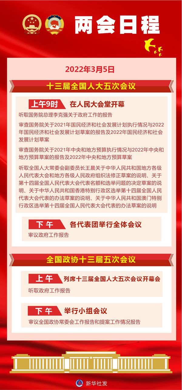 新華社北京3月4日電 十三屆全國人大五次會議5日上午9時在人民大會堂開幕,聽取國務院總理李克強關于政府工作的報告,審查國務院關于20