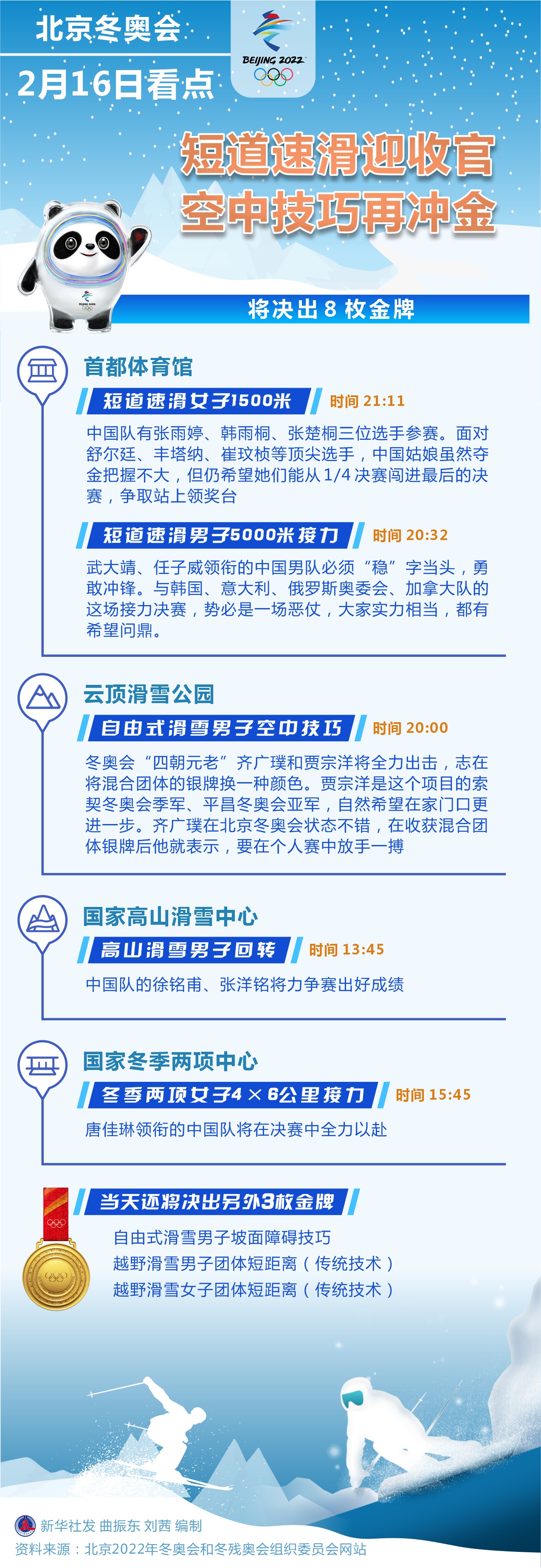 新華社北京2月15日電(記者張澤偉、王恒志)北京冬奧會16日將決出8枚金牌,其中短道速滑進入最后一個比賽日,將產生男子5000米接力和女