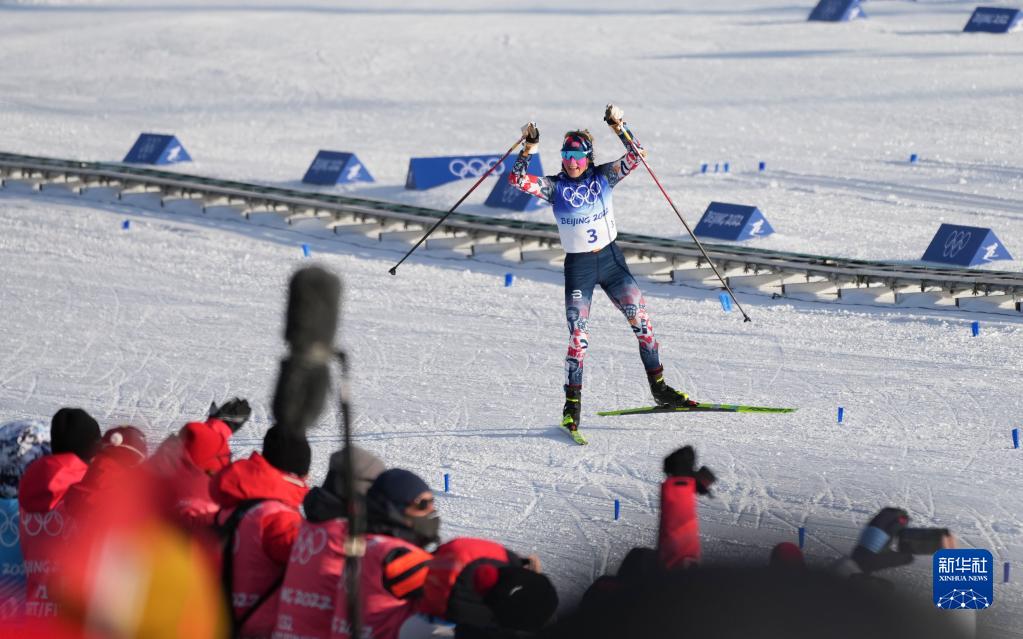 2月5日,挪威選手特蕾絲·約海于格慶祝奪冠。 當日,北京2022年冬奧會越野滑雪女子雙追逐(7 5公里傳統技術+7 5公里自由技術)比賽